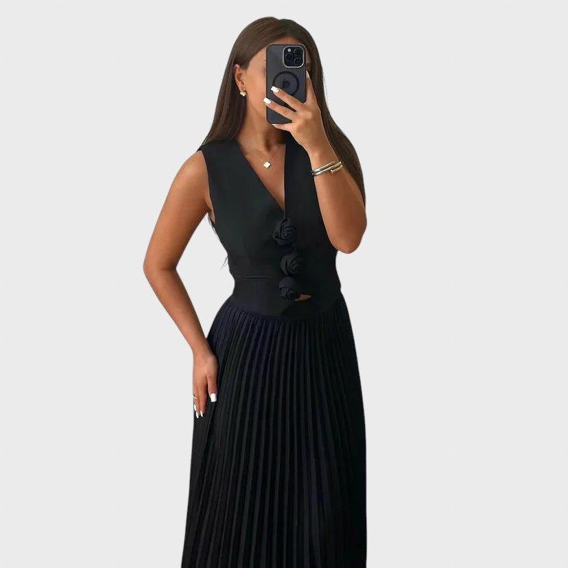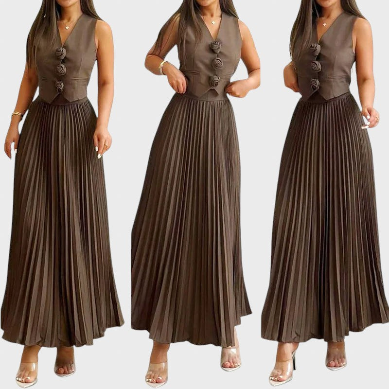 Този зашеметяващ ансамбъл е въплъщение на модерна, изтънчена елегантност, идеален за летни събития или специални поводи. Съчетавайки безупречно скроен къс потник с дълга, фино плисирана пола, облеклото създава драматичен, ефирен силует, който издължава фигурата. Нотка блясък и романтика се осигурява от трите декоративни копчета с форма на цвете на потника, превръщайки тази класическа дреха в наистина уникален и изискан вид .