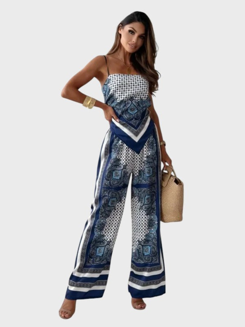 Открийте перфектната комбинация от класически чар и модерен комфорт с този комплект от две части, състоящ се от топ и панталон. Идеален за носене през целия ден, той добавя нотка на деликатност и мигновена изтънченост към всяка визия.