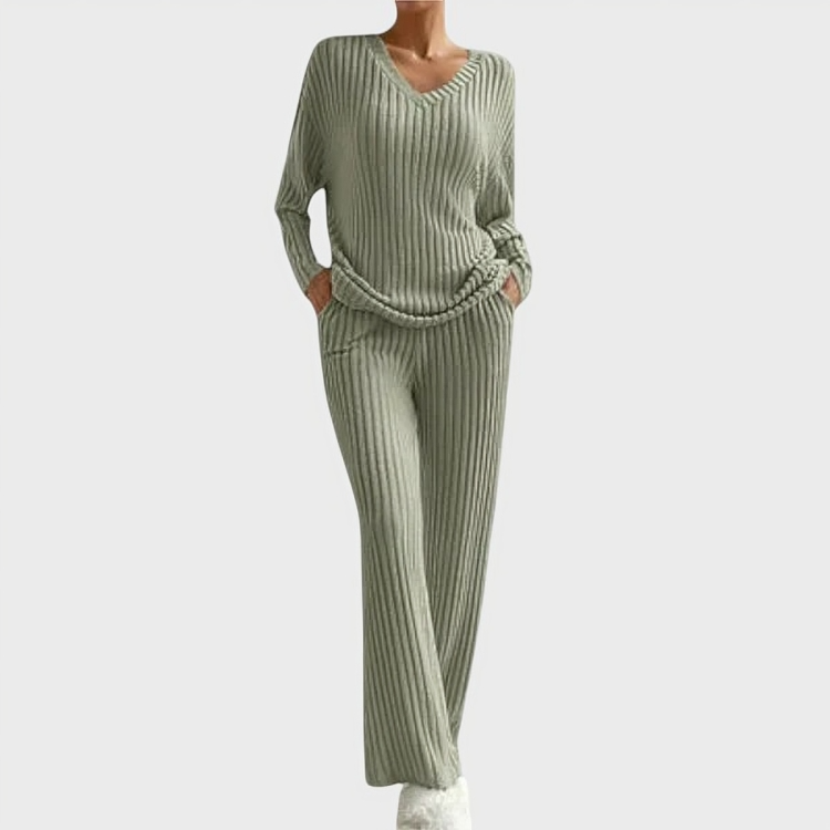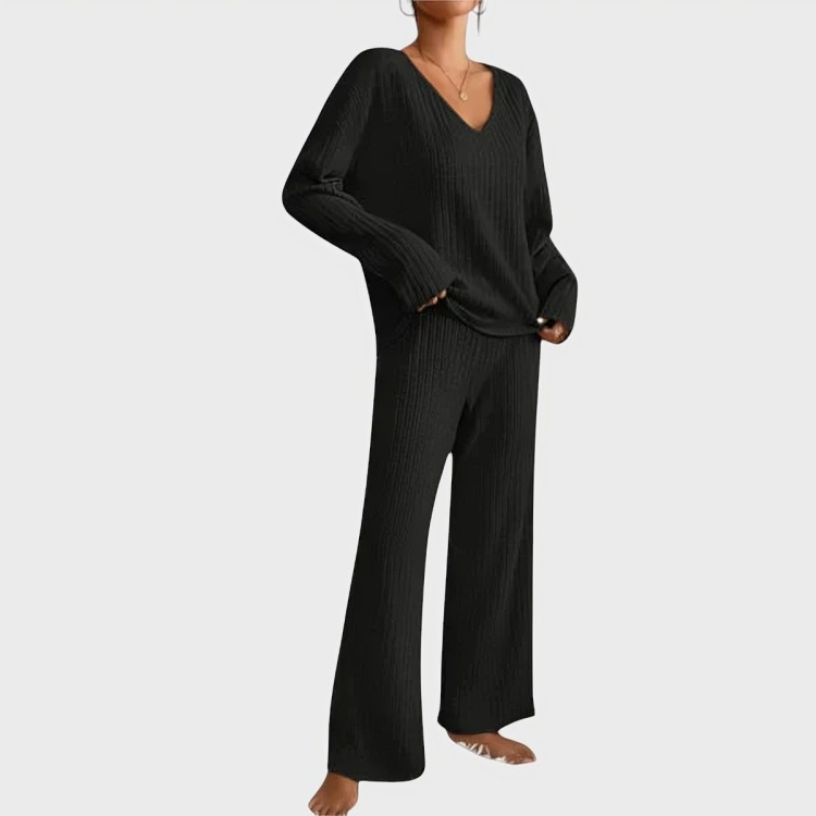 Изживейте комфорт и елегантност по нов начин с този модерен комплект за почивка. С оребрен дизайн, пуловер с V-образно деколте и широки панталони, този комплект е идеален за релакс у дома или за небрежен, но стилен външен вид, когато сте навън.