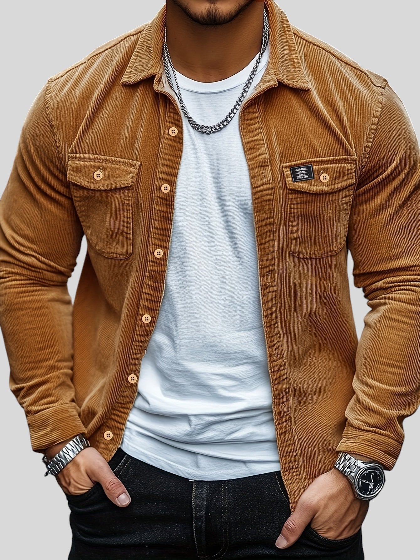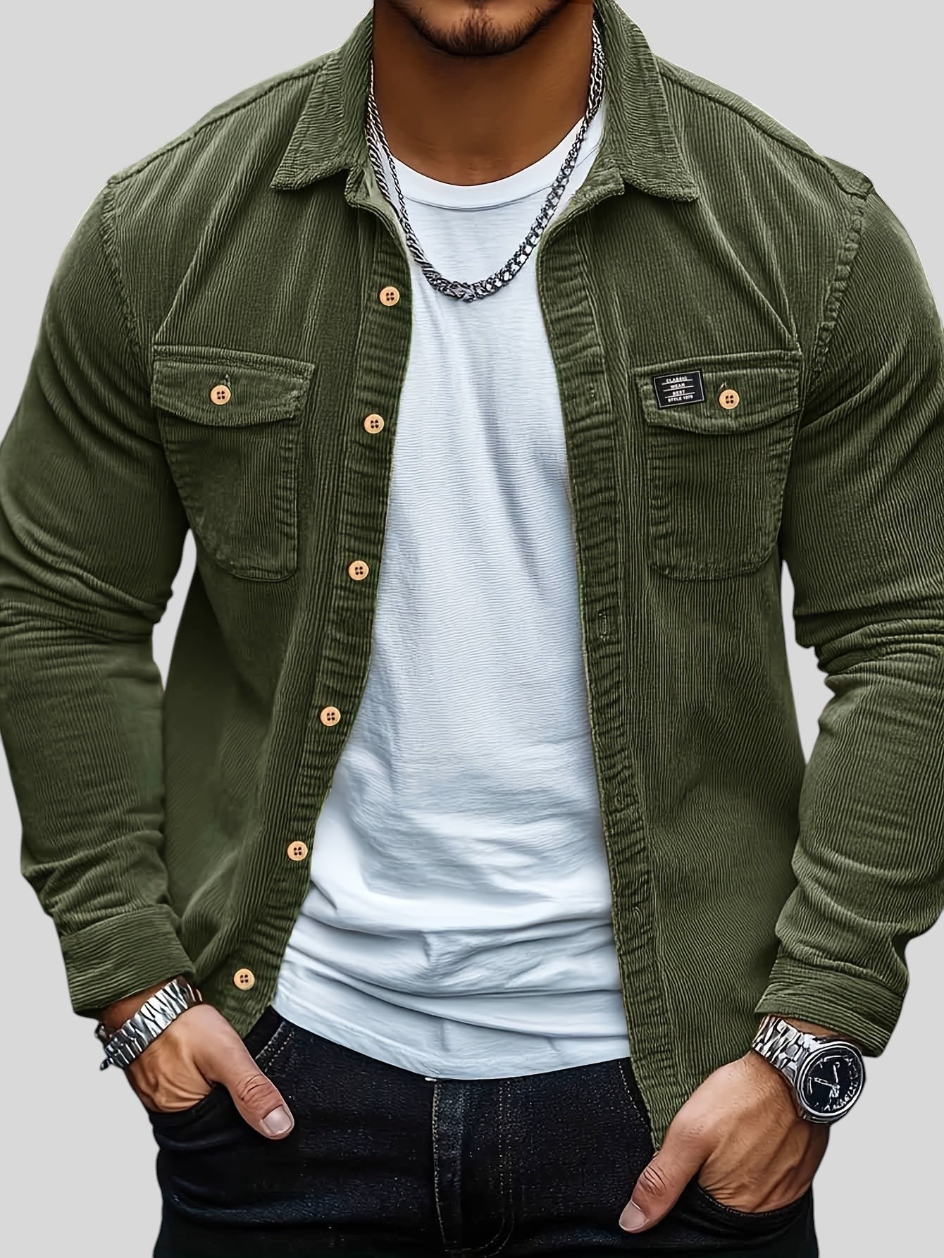 Тази ежедневна кадифена риза е идеалната дреха за мъжа, който търси перфектния баланс между непринуден стил и нотка изтънченост. С класически дизайн и текстурирана материя, тя е перфектният избор да добавите слой функционалност и комфорт към гардероба си, независимо дали е за събиране с приятели или за спокоен ден навън.
