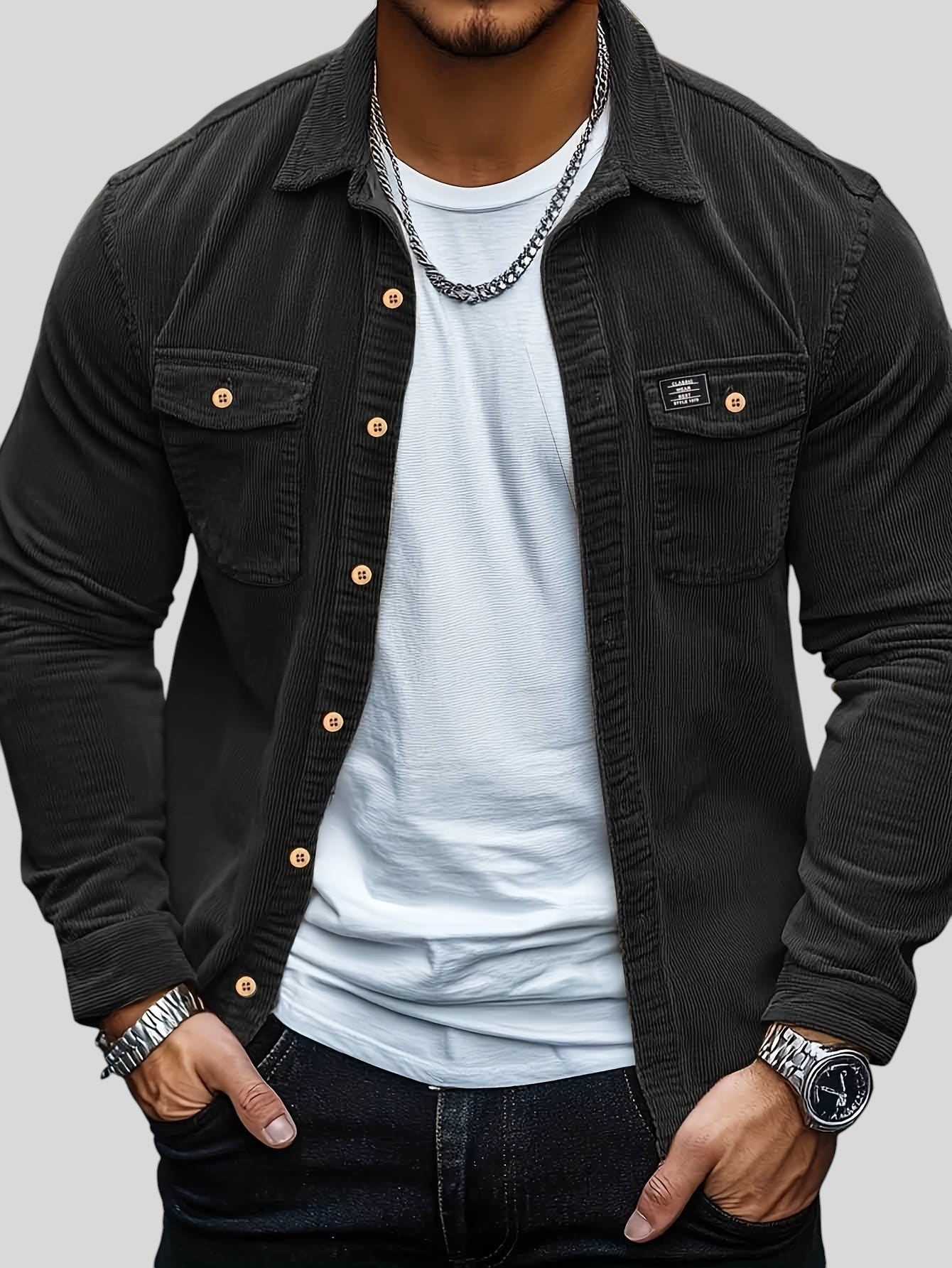• Детайли, които правят цялата разлика: Висококачественият кадифе и дискретните копчета добавят нотка функционалност и стил, която мигновено подобрява визията ви и ви гарантира, че сте готови за всеки повод.