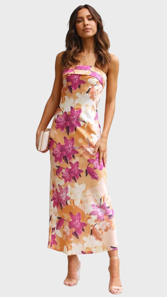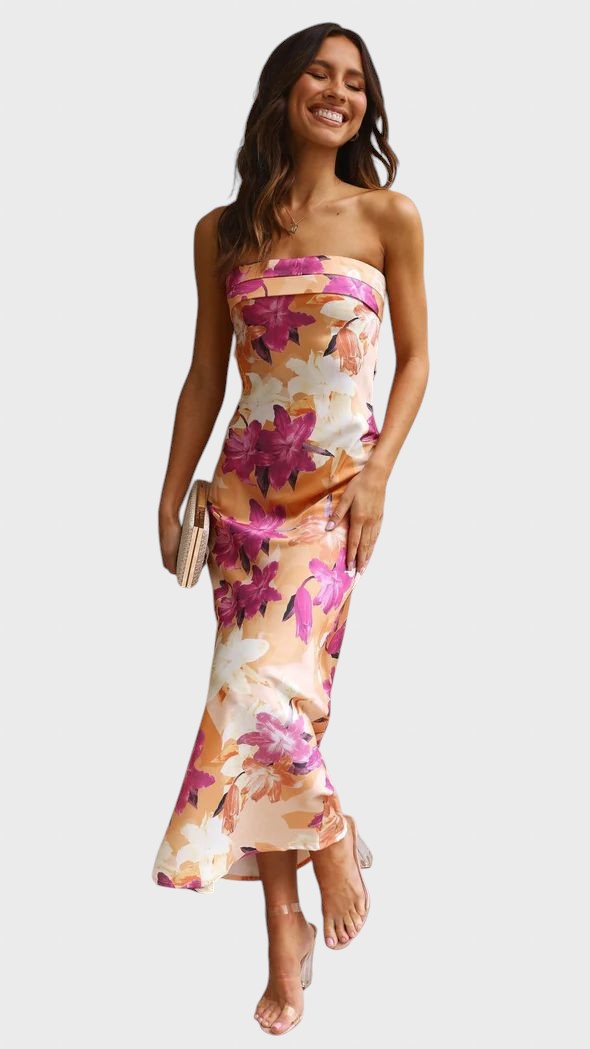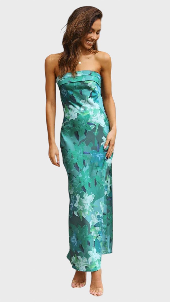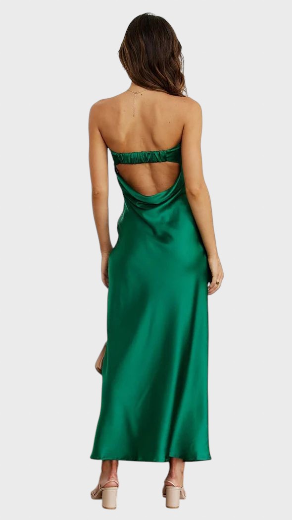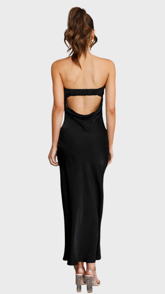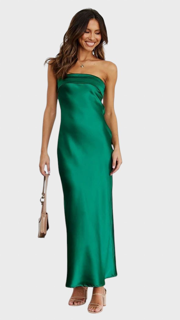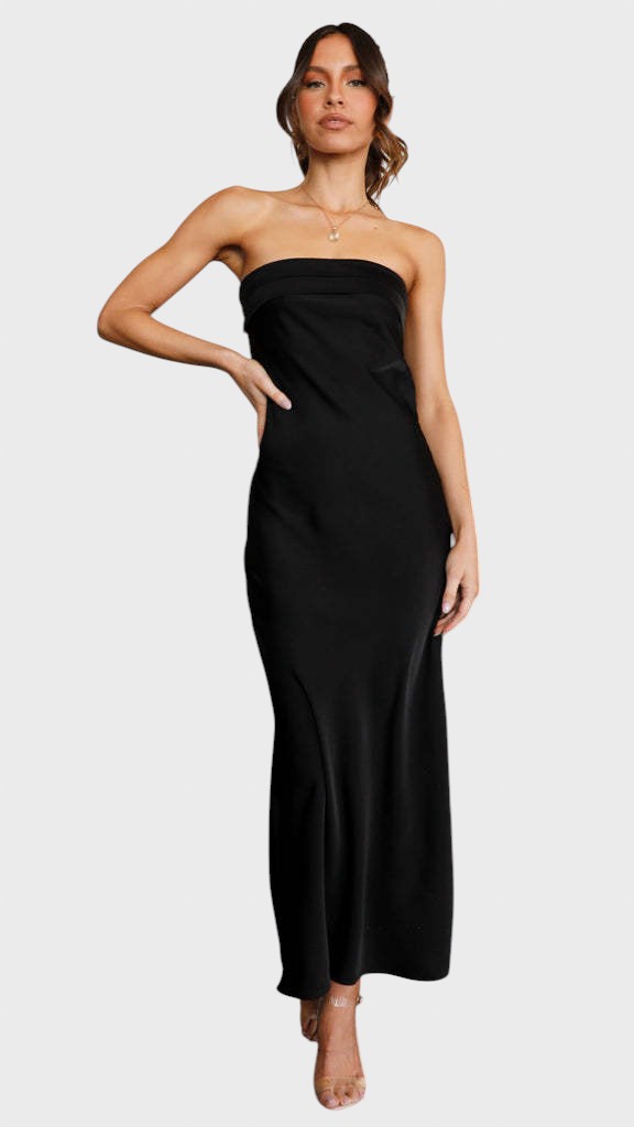 Чувствайте се като върховна богиня с нашата нова макси рокля! Тази рокля е олицетворение на минималистичен блясък , с акцент върху безупречна кройка и богата материя. Това е рокля тип бандо с просто, право деколте, което подчертава деколтето и раменете.