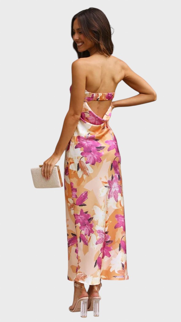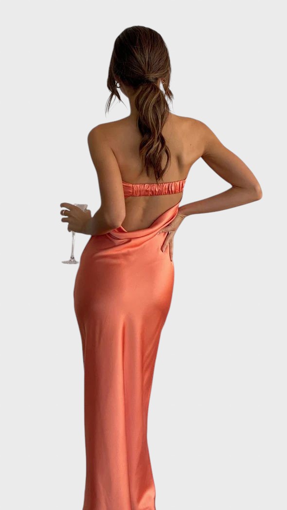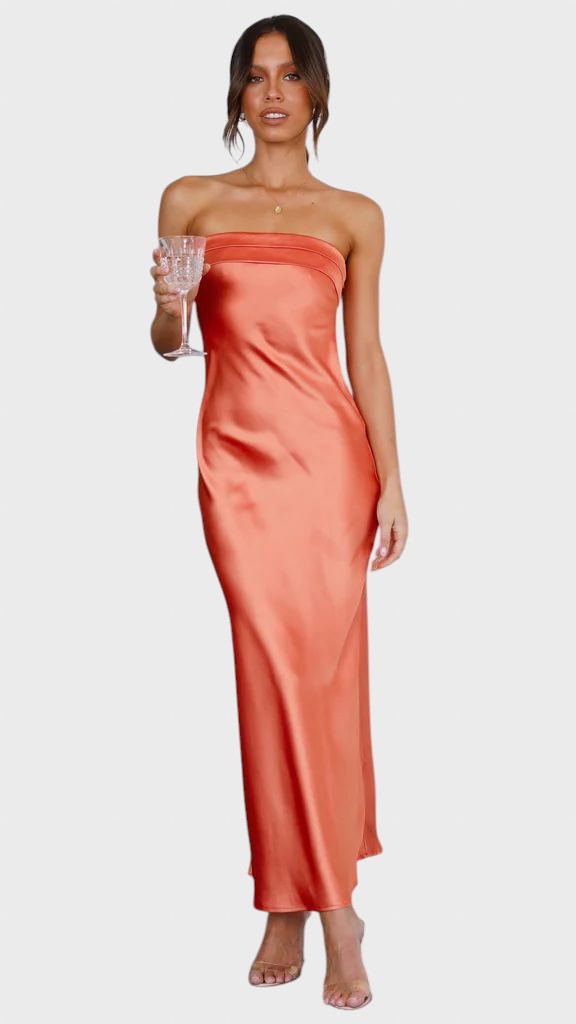 • Дизайн: Дизайнът му е очевиден в правата кройка тип „бандо“ и плавния силует, без излишни шевове. Тази елегантна простота, съчетана с блясъка на сатена, създава изчистен и изтънчен вид, който не изисква много украшения, за да се открои.