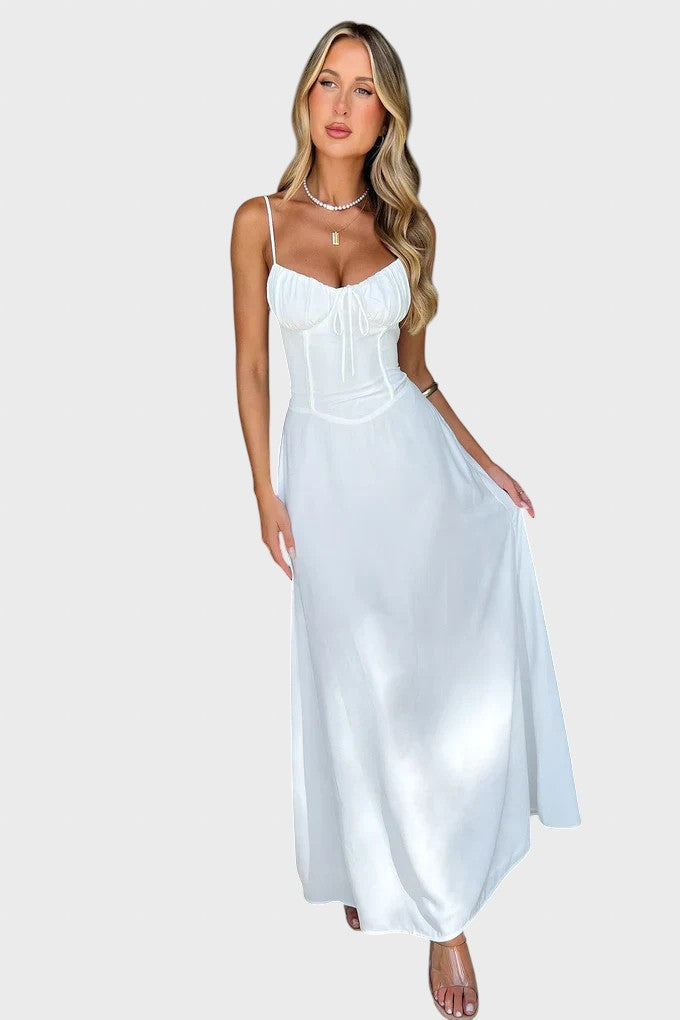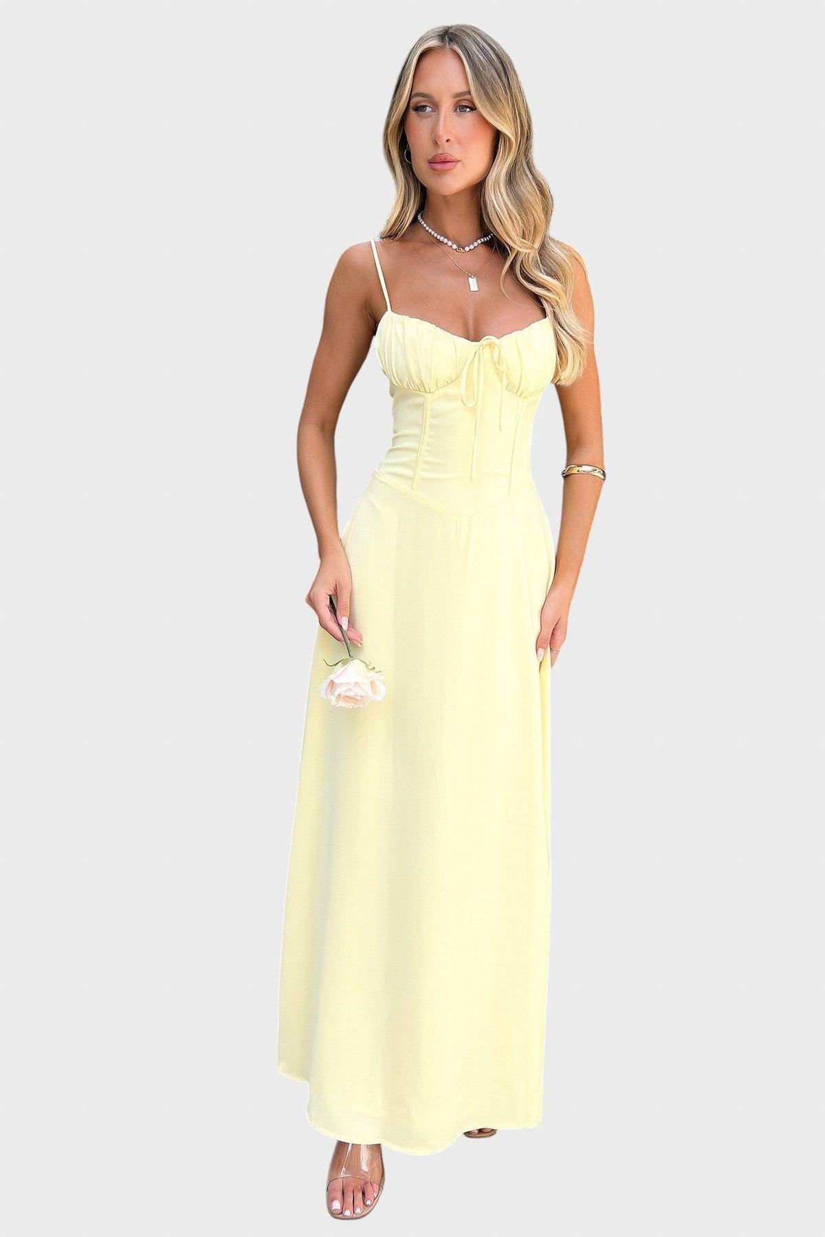 Това е олицетворение на непринудена елегантност. С детайлите с връзки и елегантния си дизайн без ръкави, тази рокля добавя нотка бохемски чар, като същевременно ви осигурява стил и комфорт за всеки повод.