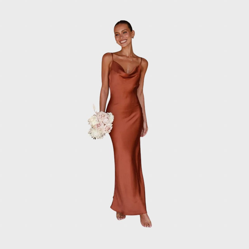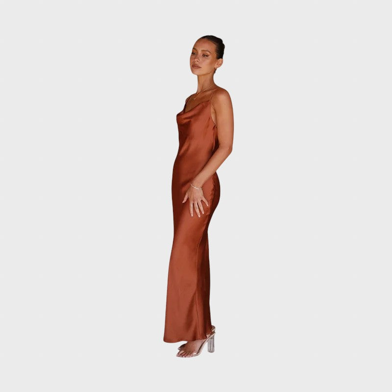 Открийте минималистичен блясък с тази зашеметяваща макси рокля. Тя е олицетворение на непретенциозната изтънченост, фокусирана върху качествена кройка и текстура.