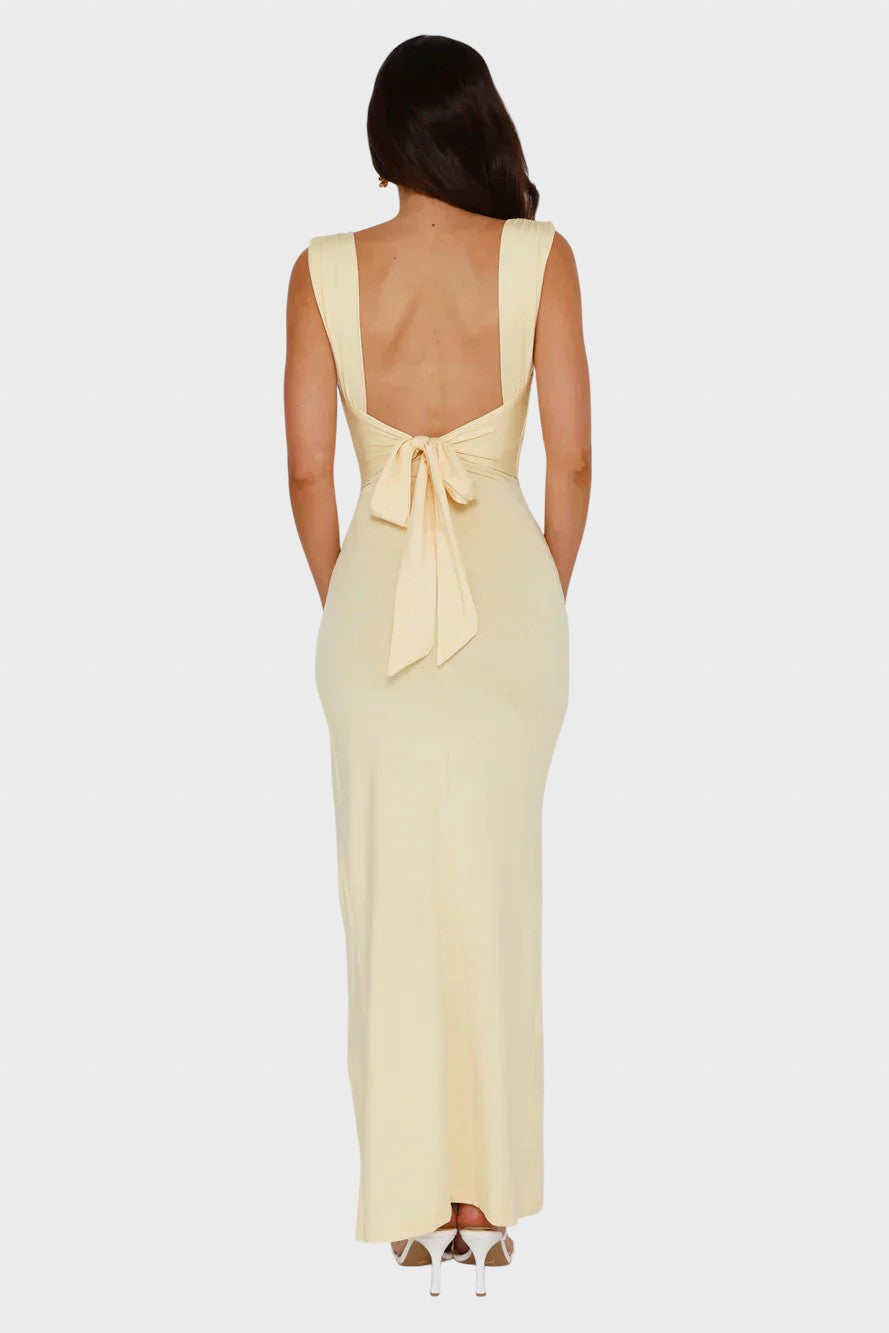 • Квадратно деколте и структурирани презрамки: Квадратното деколте е модерна класика, предлагаща нотка на изтънченост и поддръжка. Широките, леко набрани презрамки осигуряват структурен детайл, който балансира плавността на роклята.